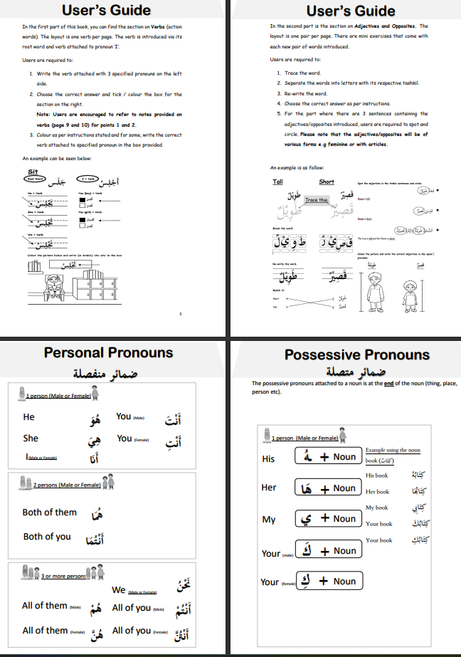 Each word introduced comes with simple exercises to help users memorise new words through repetition. Users can eventually use this book when constructing or translating Arabic sentences, or writing composition. Illustrations and coloring components have also been added to this book, with the objective of drawing interest of visual learners.