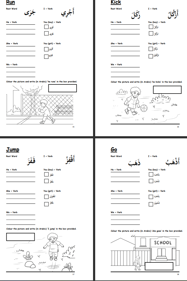 This book is a compilation of Arabic verbs, adjectives and opposites. The purpose of this book is to put together commonly used verbs, adjectives and opposites for learners’ easy reference. There are a total of 50 verbs and 50 adjectives and opposites in this book.