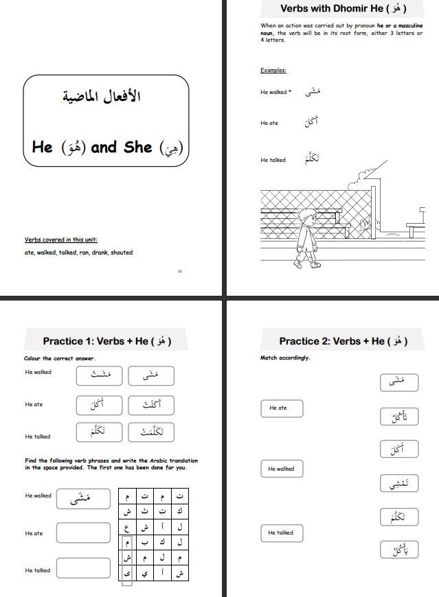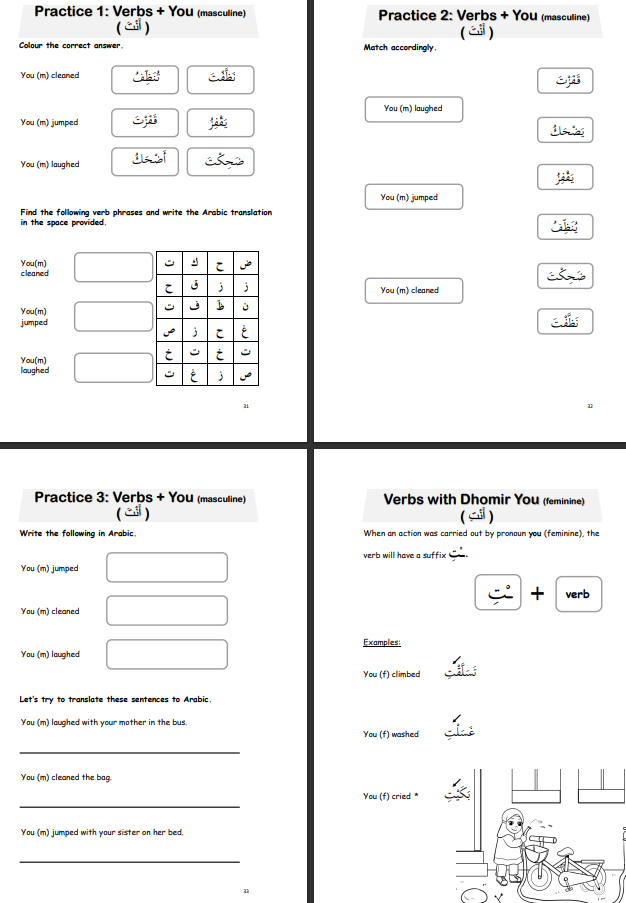 This is a book on Arabic Verb Conjugation (Past Tense). This book is created with the objective to assist our Madrasah students and adult learners to practice on Tasrifat present tense. Tasrifat, or otherwise known as conjugation, is the changing of verb root form to show (1) tense of verb (2) attached pronouns / doer. There may a prefix added to the verb root form or suffix, or both. We included all 14 pronouns in this book with variety of verbs to introduce. There are many mini exercises within various sections of this book thus the practices are plenty. We aim to build on Tasrifat knowledge a little at a time.