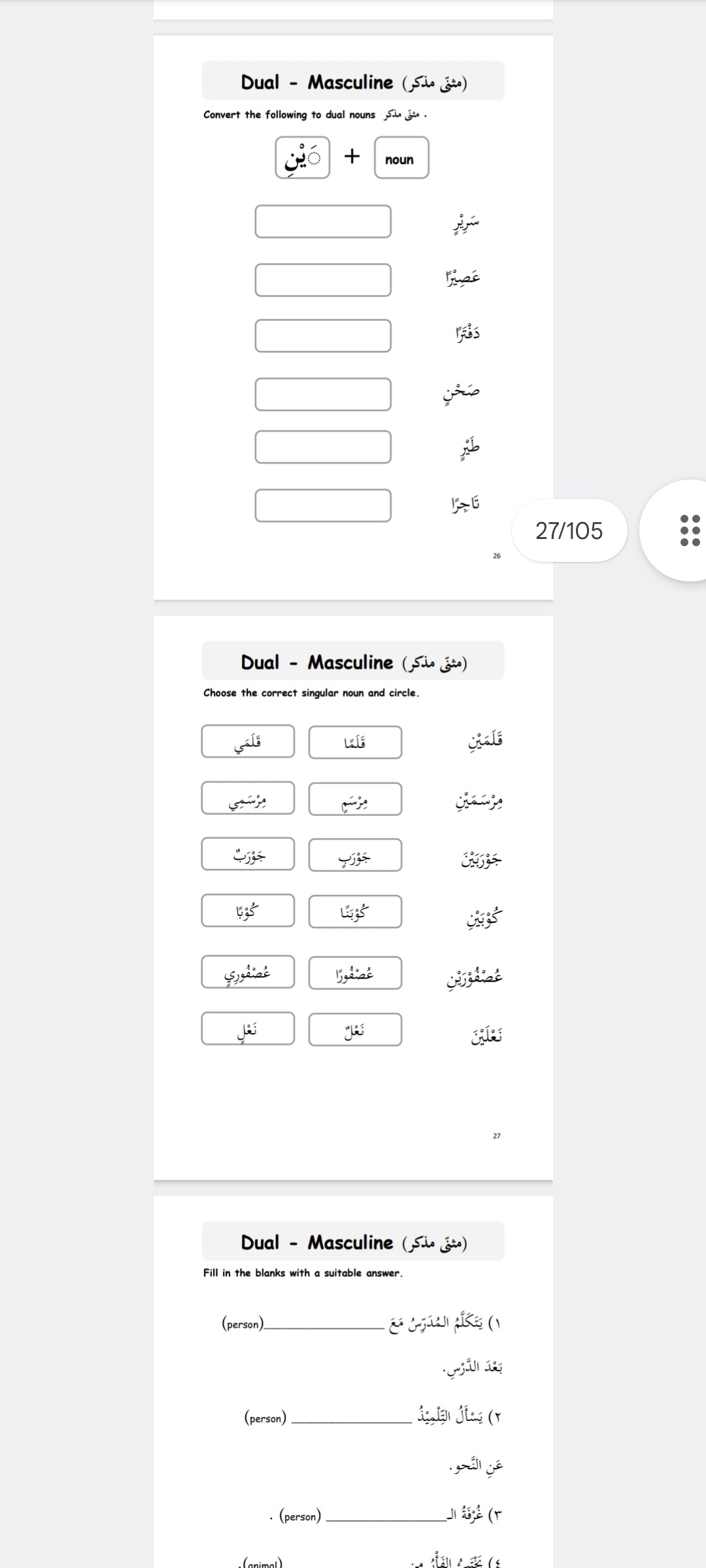 This book has been crafted with the objective of providing guidance to our Madrasah students and adult learners in their journey to practice their nouns in single, dual or plural form. They are known as Mufrad, Muthanna and Jama’.